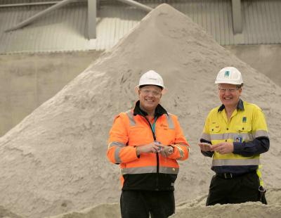 Southern Ports’ CEO Keith Wilks and Talison Lithium Production Manager Guy Meade with stockpiles of record-breaking spodumene (lithium) set for export.