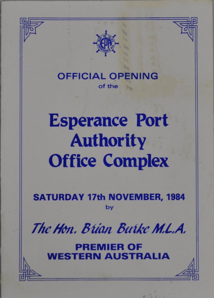 The new Esperance Port Authority Office complex was opened by the Premier, Hon. Brian Burke, MLA on 17th November. Builders were Jaxon Constructions Pty Ltd.