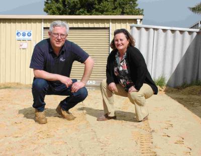 Southern Ports Regional Manager - Port of Esperance Scott Bates with Esperance Bay of Isles Community Outreach Service Delivery Coordinator Cheryl Hoffman on the foundations of where the new playground will be built.