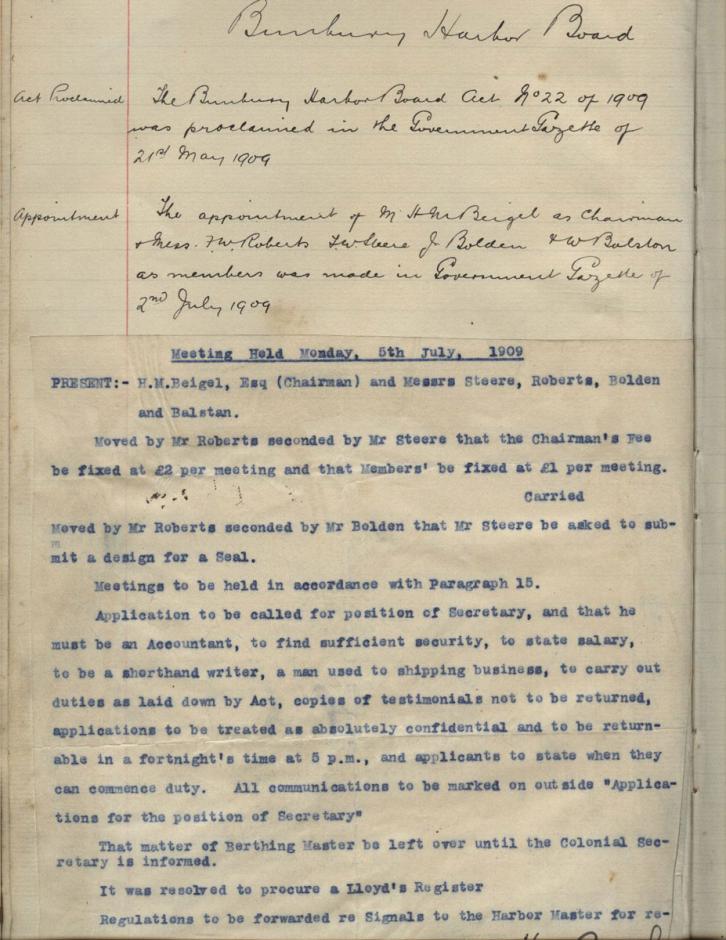 Bunbury Harbour Board was formed from 1st July, the initial Chairman being HM Beigel. The name was changed to Bunbury Port Authority in October 1967.
